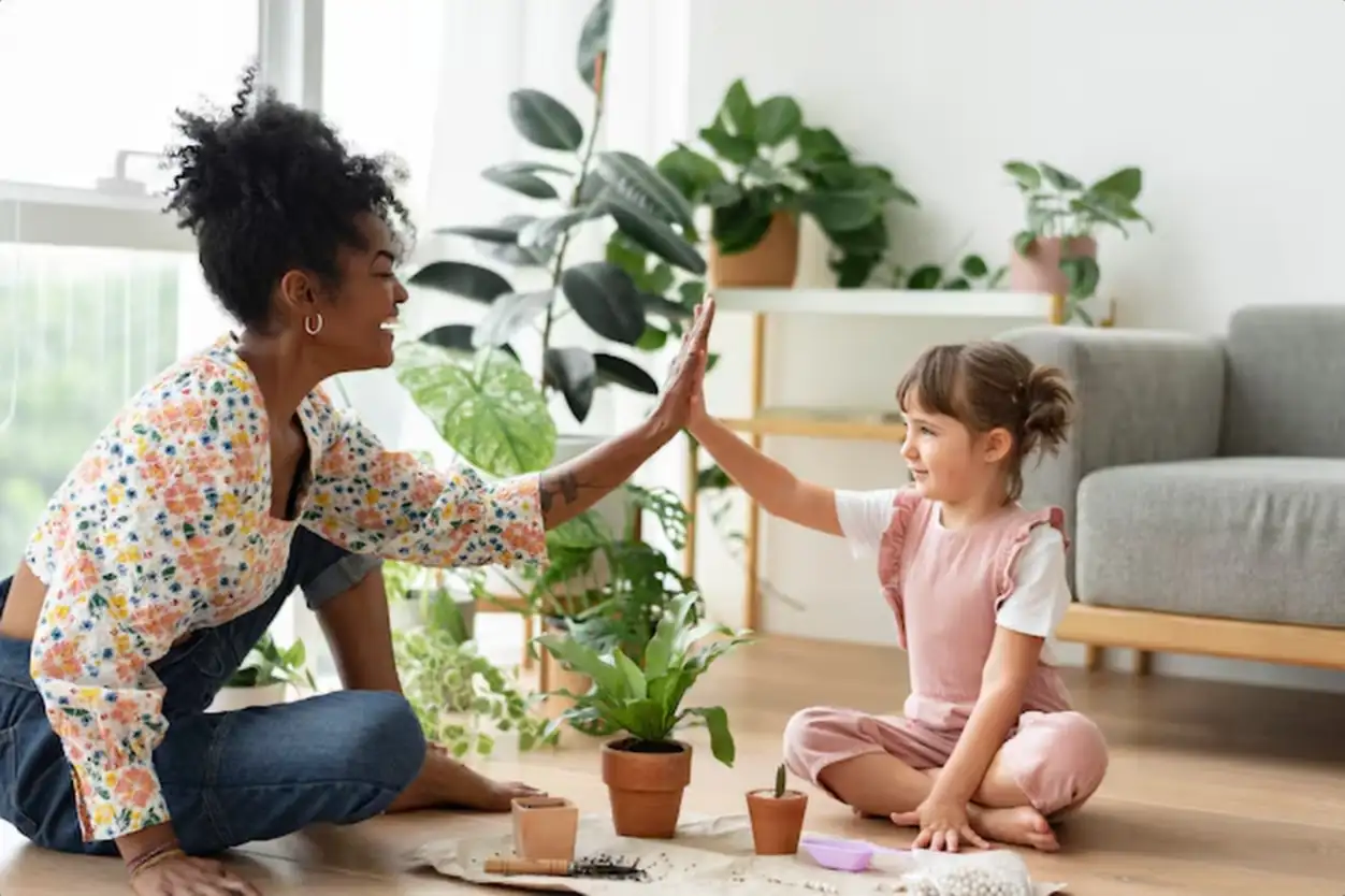 Multiracial family high five while indoor gardening